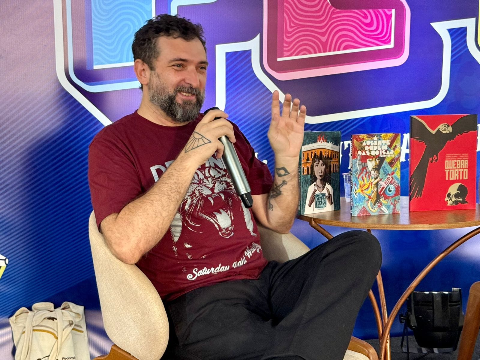 Na primeira, “Biografar em quadrinhos”, o artista gráfico e quadrinista Fábio Quill falou sobre A Casa Baís, obra que resgata a memória da pintora e musicista sul-mato-grossense Lídia Baís. Ao narrar a vida da artista a partir da perspectiva de sua própria casa, Quill propôs uma abordagem poética e inovadora. Ele ressaltou que o projeto nasceu de conversas com pessoas que conviveram com Lídia, frequentemente descrita como uma mulher à frente de seu tempo. Em sua fala, o autor traçou ainda um paralelo entre Lídia e Frida Kahlo, mulheres que fizeram da arte um espaço de liberdade e resistência.