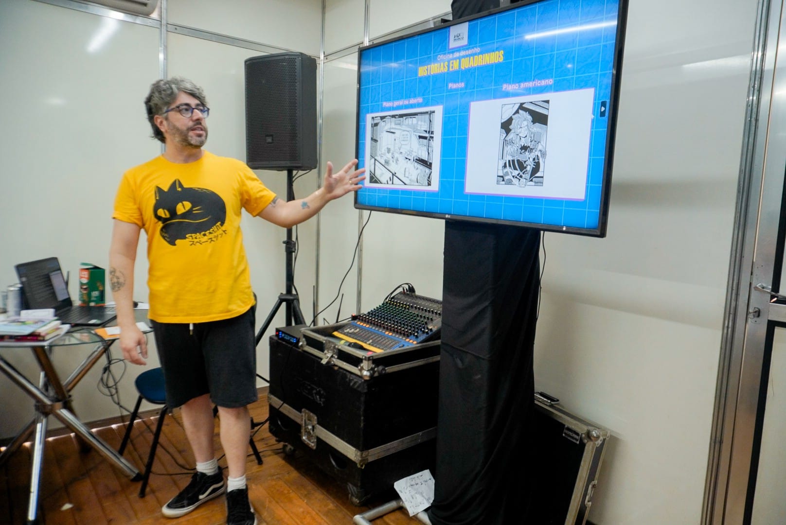 No espaço dedicado às histórias em quadrinhos, Fred Hildebrand apresentou os elementos básicos de uma página – quadros, balões, sarjetas e onomatopeias – e destacou que a linguagem não exige um traço perfeito, mas clareza narrativa. “O quadrinho independe do estilo de desenho. Você pode começar com o que tem e, a partir daí, pensar a narrativa. Mais do que desenhar bem, é preciso organizar a cena para que o leitor compreenda a história”, explicou. A oficina incluiu exercícios práticos, em que os participantes criaram tiras baseadas em vivências pessoais e trabalharam com um roteiro do personagem Homem Grilo.